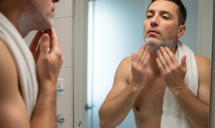 men skincare Philippines routine with a man checking his skin after shaving